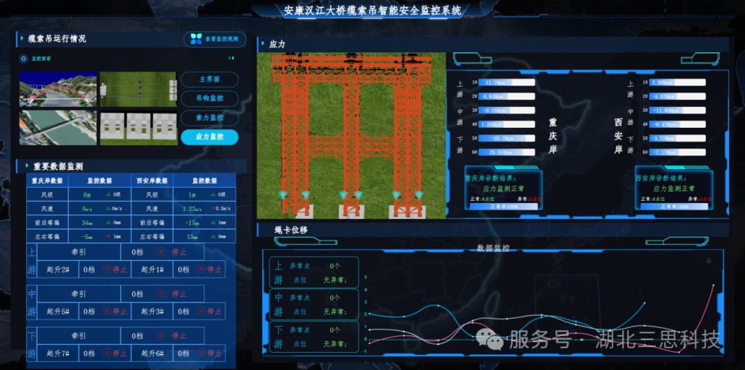 由湖北三思科技自主研發(fā)的纜索吊集中智能控制系統(tǒng)正式亮相本次載荷試驗(yàn)。本系統(tǒng)對(duì)主承重索、牽引索、纜風(fēng)索、扣索、背索等索力及起重拉力、塔偏、錨碇與錨梁位移、卷?yè)P(yáng)機(jī)溫度等進(jìn)行實(shí)時(shí)監(jiān)測(cè),將視頻與數(shù)據(jù)平臺(tái)結(jié)合,直面施工現(xiàn)場(chǎng)卷?yè)P(yáng)機(jī)工作情況,真實(shí)反映吊裝過(guò)程中受力情況及塔偏,有異常情況系統(tǒng)會(huì)自動(dòng)報(bào)警,保證纜索吊系統(tǒng)的安全穩(wěn)定性,為整個(gè)吊裝過(guò)程提供安全強(qiáng)有力保證。